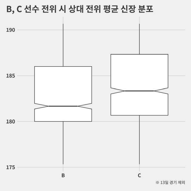 이 말씀 자체는 사실입니다. 두 선수가 전위에 자리 잡고 있을 때 상대 전위 선수 세 명 평균 신장을 확인해 보면 B 선수는 182.8cm, C 선수는 183.5cm로 C 선수 쪽이 더 높았습니다.