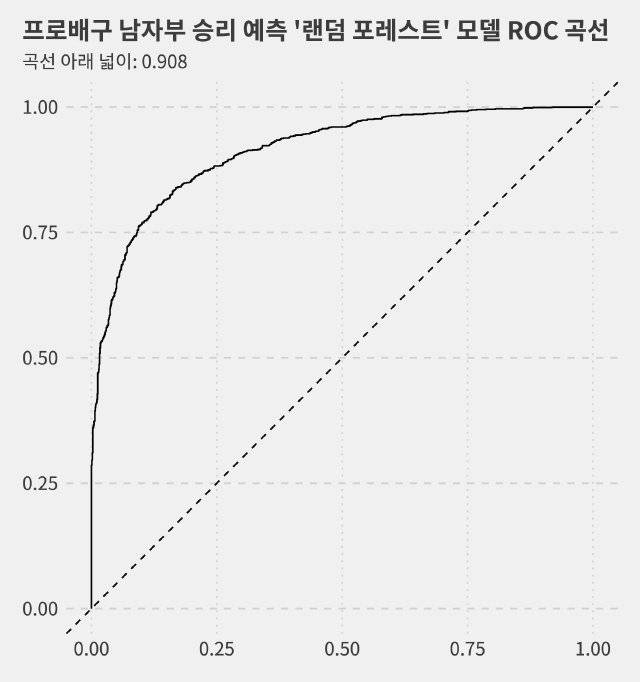 어떤 머신러닝 모델 성능을 평가할 때는 ROC 곡선을 이용합니다. 이 랜덤 포레스트 모델 ROC(수신자 조작 특성) 곡선은 아래와 같습니다. 이 곡선 아래 면적이 1에 가까울수록 모델 성능이 뛰어나다고 평가합니다. 이 랜덤 포레스트 모델에서 곡선 아래 넓이를 계산하면 0.905가 나옵니다. 급하게 만든 모델치고는 나쁘지 않은 성능입니다.