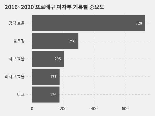 ‘(공격 성공 - 공격 범실 - 상대 블로킹에 차단) ÷ 총 공격 시도’로 계산하는 공격 효율은 배구 승패를 결정하는 가장 중요한 기록입니다. 적어도 2019~2020 시즌까지 최근 5 시즌 동안 한국 프로배구에서는 남녀부 모두 확실히 그랬습니다.
