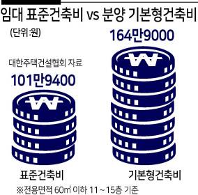 대한주택건설협회에 따르면 11∼15층 기준(전용 60㎡ 이하) 현재 표준건축비는 ㎡당 101만9400원으로, 기본형 건축비(분양가상한제 적용주택) 164만9000원의 62% 수준이다. 업계에서는 건축비의 대부분을 차지하는 토목과 골조가 크게 다르지 않은 만큼 두 건축비의 격차는 비정상적이라는 입장이다.