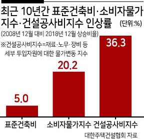 표준건축비는 지난 2008년 이후 10년간 5% 오르는데 그쳤지만, 같은 기간 소비자물가지수와 건설공사비지수(재료·노무·장비 등 세부 투입자원에 대한 물가변동 지수)는 각각 20.2%, 36.3% 상승했다.