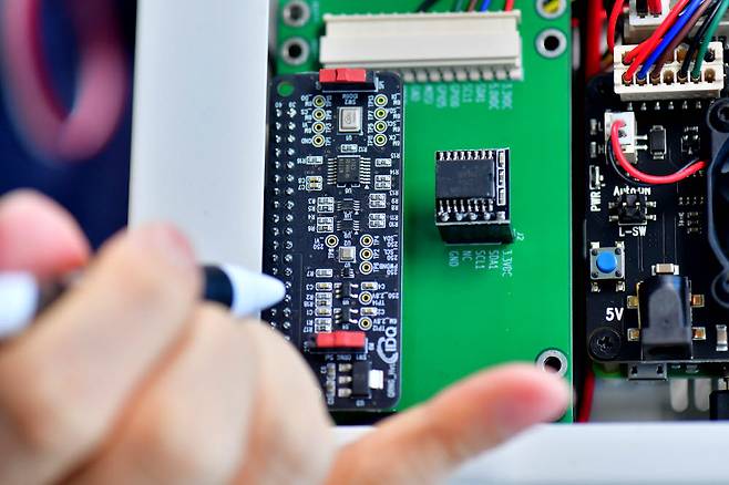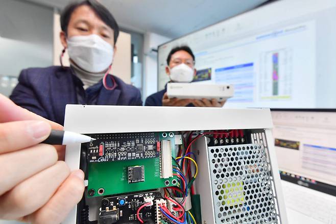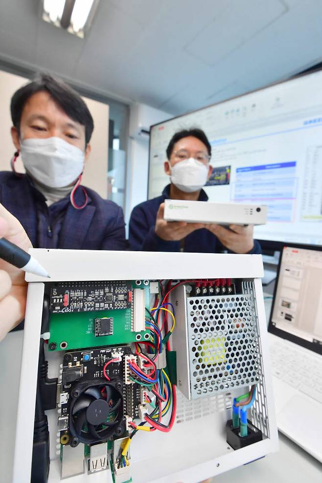 SK텔레콤 자회사 IDQ와 그린존시큐리티가 양자난수생성(QRNG) 칩을 적용한 양자암호 보안게이트웨이를 공동 개발했다. 17일 서울 그린존시큐리티 연구원이 사물인터넷(IoT) 데이터 암·복호화를 위한 게이트 장비에 QRNG 칩이 적용된 모습을 보여 주고 있다.