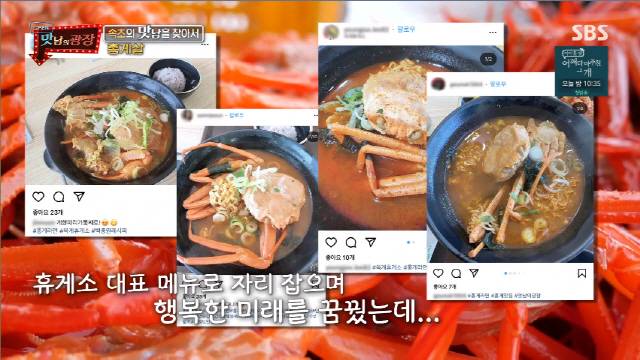 이날 백종원은 "우리 주제가 떠있다"며 바다를 가리켰다. 바로 바다 위를 둥둥 떠다니는 홍게였다. 대게보다 저장성이 조금 떨어진다는 이유로 상품성이 떨어진다고. 이에 백종원은 홍게를 듬뿍 넣은 라면으로 휴게소 메뉴를 만든 바 있다.