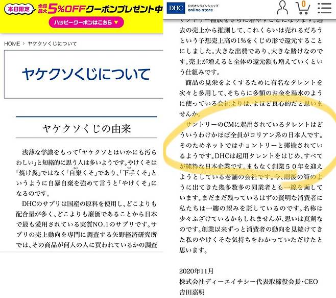 그룹을 대표하는 회장 명의로 재일 및 귀화자들을 차별하고 '촌토리'(조선인+산토리)라는 차별적 용어가 담긴 글을 당당하게 게시한 것이다. 이 안내문이 지난 15일 알려지자 트위터에서는 "DHC의 상품은 사지 않겠다"라는 해시태그가 '오늘의 트렌드' 2위에 올라오기도 했다.