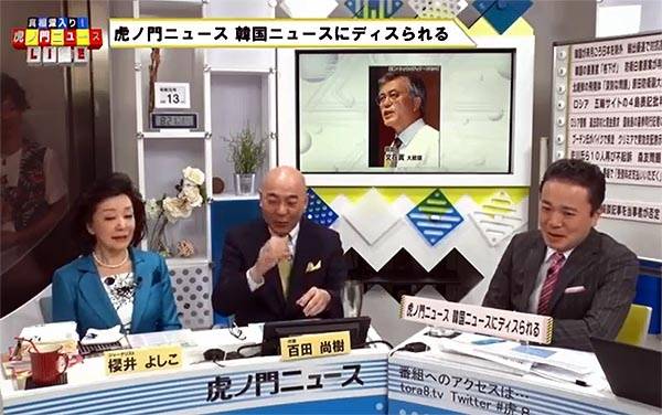 | ▲ 2019년 8월 13일 오전 DHC테레비의 '도라노몬뉴스'에서 출연자 햐쿠타 나오키(가운데)가 맥주를 따라 마시는 흉내를 내며 한국의 일본제품 불매운동을 조롱하고 있다. |