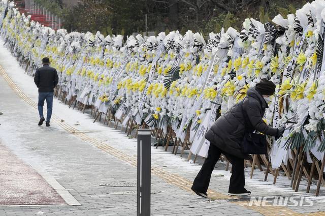 [서울=뉴시스] 김병문 기자 = 윤석열 검찰총장이 자신에 대한 정직 2개월 처분을 취소해달라는 소송과 함께 징계 처분 효력을 멈춰달라는 집행정지 신청을 법원에 제출한 가운데 18일 오전 서울 서초구 대검찰청 앞에 근조화환이 세워져 있다 2020.12.18. dadazon@newsis.com
