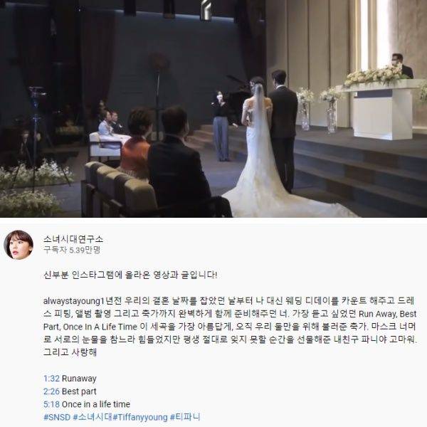 지난 7일 유튜브 채널 '소녀시대 연구소'에는 티파니 영의 친구가 공개한 축가 영상이 올라왔습니다.