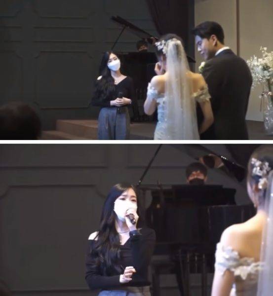 축가를 시작하기 전 티파니는 "가장 소중한 친구와 친구가 사랑하는 남자를 보며 훌륭한 남녀라고 생각했다. 매 순간을 최고로 만드는 두 사람에게 많이 배웠다"며 신랑 신부에게 진심을 담은 축하를 건넸습니다. 특히 티파니가 마스크를 착용하고 심플한 무채색 의상을 입고 있어 눈길을 끌었습니다.