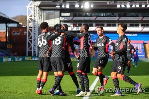 epa08893388 Takumi Minamino (2-L) of Liverpool celebrates with teammates after scoring a goal during the English Premier League soccer match between Crystal Palace and Liverpool FC in London, Britain, 19 December 2020. EPA/Clive Rose / POOL EDITORIAL USE ONLY. No use with unauthorized audio, video, data, fixture lists, club/league logos or 'live' services. Online in-match use limited to 120 images, no video emulation. No use in betting, games or single club/league/player publications.