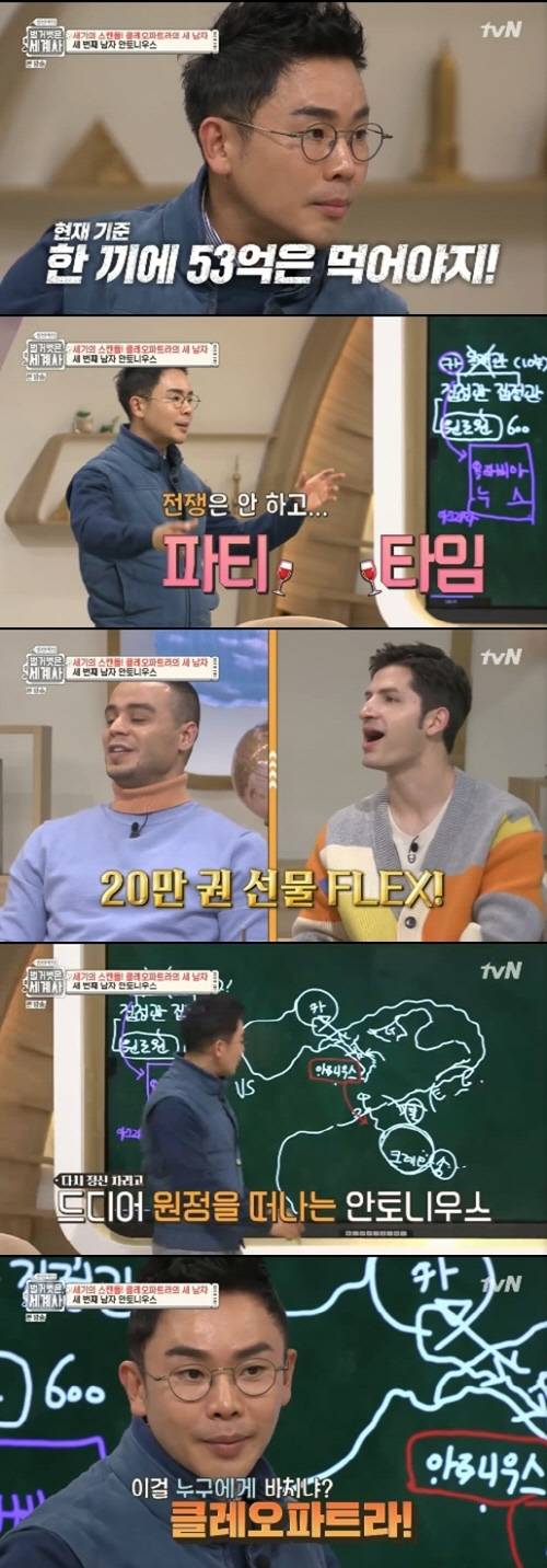 설민석은 "자신을 정말 사랑하는지 시험을 해보려고 죽었다고 거짓말을 했다는 설이 있다. 죄책감 때문에 너무 슬퍼 무릎을 꿇고 자신의 얼굴로 피를 닦았다. 오열을 하면서 피멍이 들도록 자신의 가슴을 쳤다. 죽어가던 안토니우스는 마지막 유언으로 목숨을 부지하라고 말하고 클레오파트라의 품에서 숨을 거뒀다. 클레오파트라도 39세의 나이에 뱀이 자기 몸을 물게 해 떠났다. 어떻게 죽었는지 지금도 모르지만 가장 정실로 여기는 이야기다"라고 밝혔다.