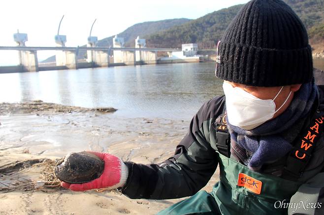 | ▲ 곽상수 마을이장이 12월 20일 낙동강 합천창녕보 상류에서 귀이빨대칭이를 발견해 들어 보이고 있다. |