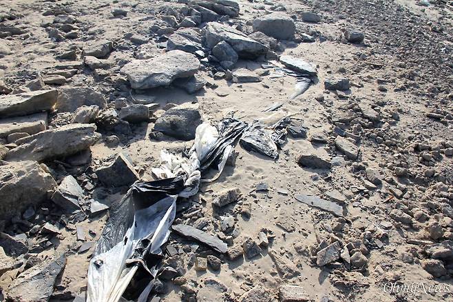 곳곳에 쓰레기가 즐비했다. 폐건설자재인 철근뿐만 아니라 비닐과 마대자루, 그물 등 어구, 또 드럼통도 여기저기서 발견되었다.