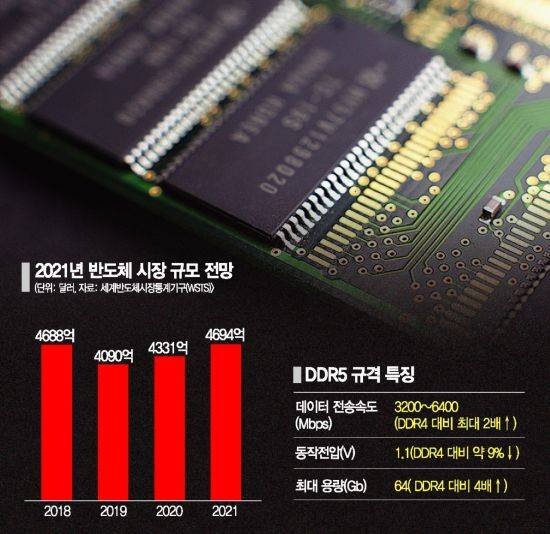 21일 관련 업계에 따르면 D램시장 1위인 삼성전자는 내년 하반기께 DDR5 D램을 시장에 본격적으로 출시할 계획이다. DDR5는 현재 범용으로 쓰이는 DDR4 D램보다 전송 속도와 용량이 월등히 빠른 차세대 제품이다. 데이터 전송 속도는 최대 6400Mbps(메가비트)로 DDR4의 3200Mbps에 비해 2배가량 빠르다.