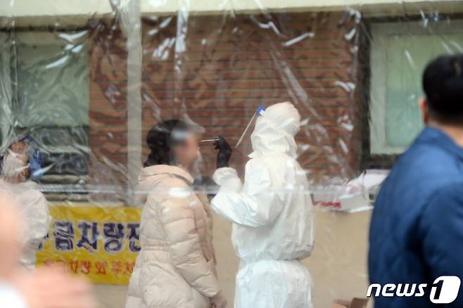 (광주=뉴스1) 정다움 기자 = 21일 오전 광주 남구 광주기독병원 선별진료소에서 해당 병원 의료진이 신종 코로나바이러스 감염증(코로나19) 진단 검사를 받고 있다.