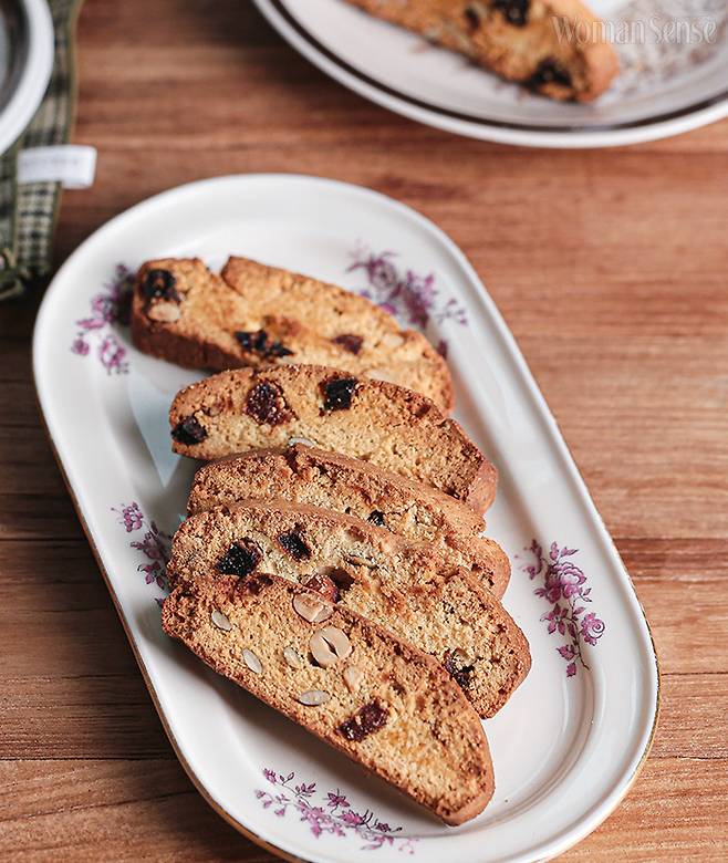 밀가루(박력분) 220g, 아몬드가루 120g, 베이킹 파우더 3g, 버터 70g, 달걀 2개, 설탕 150g, 아몬드 40g, 호박씨·캐슈너트·크랜베리·건살구 20g씩