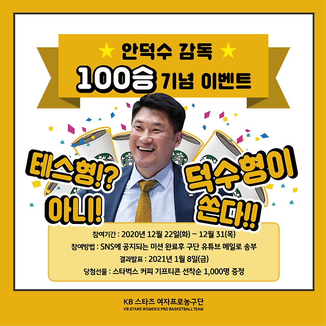 앞서 KB스타즈 유튜브 채널 ‘국민농구방송’에 출연한 안덕수 감독은 “제가 100승을 한다는 것은 팬 여러분들이 함께 싸워주시고 응원해주신 덕분이라고 생각한다”며 팬들에게 커피 1,000잔을 선물하고 싶다는 공약을 밝힌 바 있다.