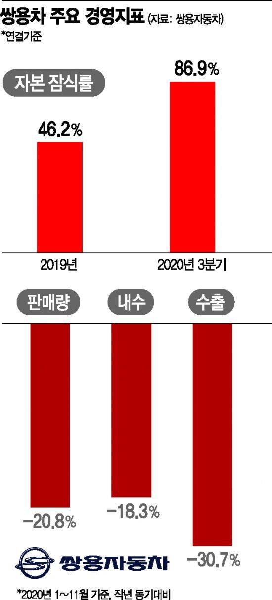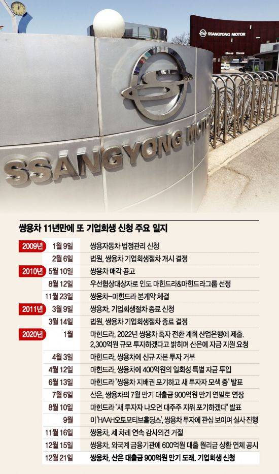 하지만 쌍용차와 마힌드라, HAAH 측의 '3개월 동맹' 계획이 수포로 돌아갈 경우 법정관리행은 불가피하다. 쌍용차는 1650억원에 달하는 대출을 갚을 여력이 없다. 쌍용차는 2007년 이후 한 해(2016년)를 제외하고 10여년 동안 적자가 누적된 상태다. 올해 1~3분기 영업손실은 3089억원으로 지난해 연간 적자 규모(2819억원)를 이미 넘어섰다.