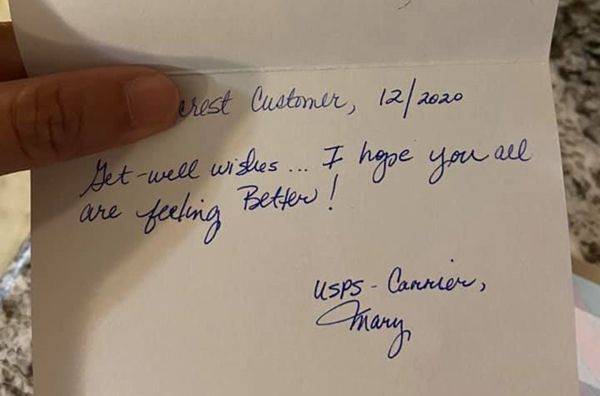 "빨리 쾌차하시길 바랍니다"라는 짧은 글과 함께 우편 집배원 메리 씨의 서명이 적혀 있었기 때문입니다.