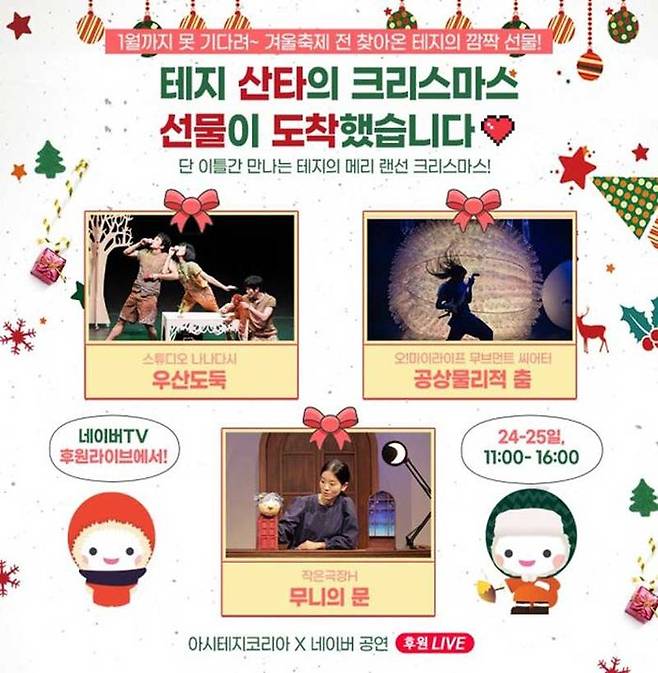 [▶네이버TV 공연 라이브]에서도 여러 편 공연 중계가 진행되는데요, '신과 함께 저승편'(24일), 국제어린이청소년연극협회 아시테지 코리아에서 인기작품 세 편으로 구성한 메리 랜선 크리스마스(24, 25일), 뮤지컬 '몬테크리스토' 리허설(25, 26일), 리처드 용재 오닐 송년음악회 '선물' (27일), 뮤지컬 '베르테르'(28일), 뮤지컬 '시데레우스'(30일) 등이 유료 상영됩니다.