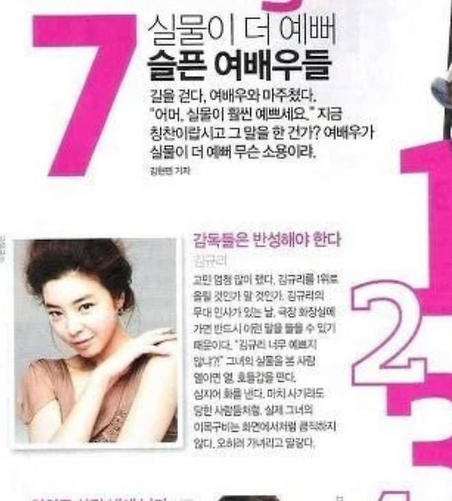 김규리는 지난 23일 SNS에 '실물이 더 예뻐 슬픈 여배우 7인'이라는 잡지 기사를 찍은 사진을 게재했다.