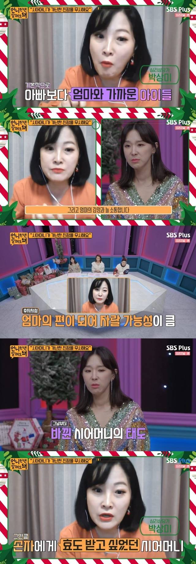 박상미 심리상담가는 “내 아이를 당당하게 멋진 아이로 크게 하고 싶다면 남편과 어머니에게 물어봐야 한다. 효도하는 아이로 키우기 바란다면 아이 성장에 좋지 않다고 말할 수 있는 용기를 가지면 좋겠다”고 조언했다. (사진=SBS플러스 ‘언니한텐 말해도 돼’ 캡처)