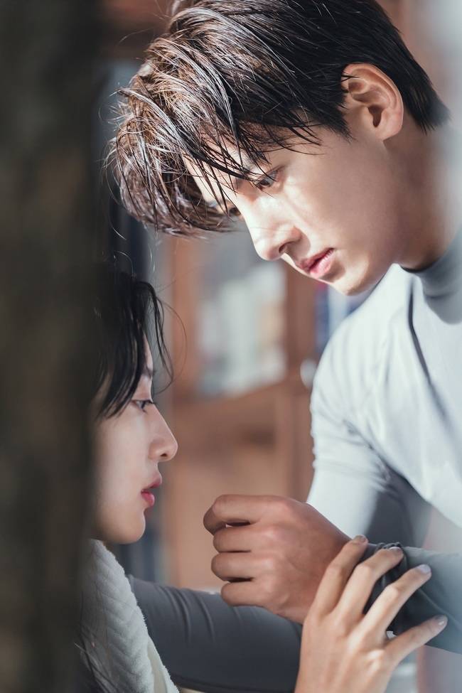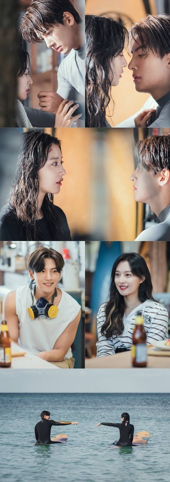 그런 가운데 공개된 사진 속 박재원과 이은오의 모습은 본격 로맨스의 시작을 알린다. 막 서핑을 끝내고 온 듯 바닷물에 젖어 있는 이은오의 이마에는 어쩐 일인지 생채기가 나 있다. 이를 걱정스러운 눈으로 들여다보는 박재원. 서로를 바라보는 두 사람 사이엔 묘한 텐션이 감돈다. 서로에게 이끌리듯이 다가선 박재원과 이은오의 키스 1초전 모습은 심장을 두근거리게 만든다. 낭만적인 여행지, 잊을 수 없는 사랑에 빠져든 두 사람만의 시간이 벌써부터 짜릿한 설렘을 예고한다.