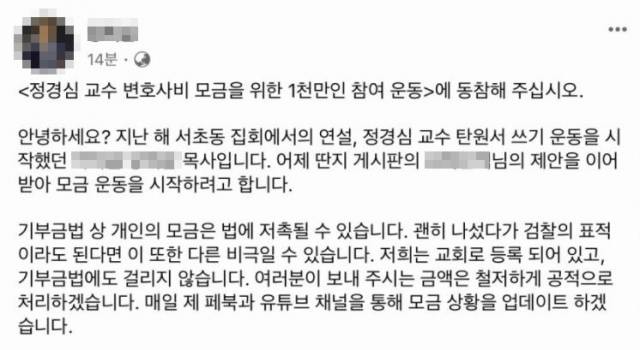 구체적인 방안도 나왔다. 목사 양모씨는 24일 페이스북에 “조국 전 장관님은 이런 걸 결코 동의하지 않을 것”이라며 “내가 총대를 메겠다. (정 교수는) 깨끗하게 살다가 당한 분이다. 그분을 돕지 않으면 안될 때”라고 했다.