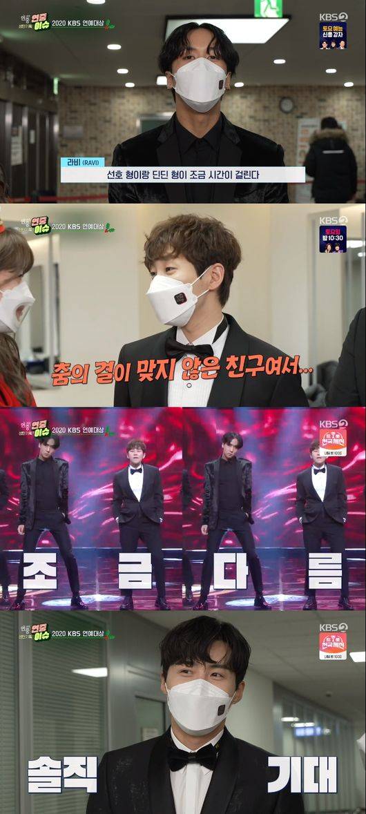 연예대상을 위해 특별 무대를 준비한 1박 2일 팀에게 "누가 제일 춤을 못추냐"고 묻자, 라비는 "딘딘 형과 선호 형이 따라오는데 시간이 좀 걸린다"고 답했다. 이에 딘딘은 "저와 느낌이 다른 것일 뿐, 춤을 못 추지는 않는다"고 말해 모두를 웃음짓게 했다.