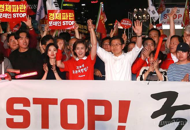 | ▲ 자유한국당 '문재인 STOP' 장외집회 자유한국당 황교안 대표와 나경원 원내대표가 25일 오후 서울 세종문화회관앞에서 열린 '문재인 STOP! 국민이 심판합니다' 집회에서 당원들과 함께 청와대 행진을 준비하며 당원들에게 손을 잡아 들고 인사하고 있다. |