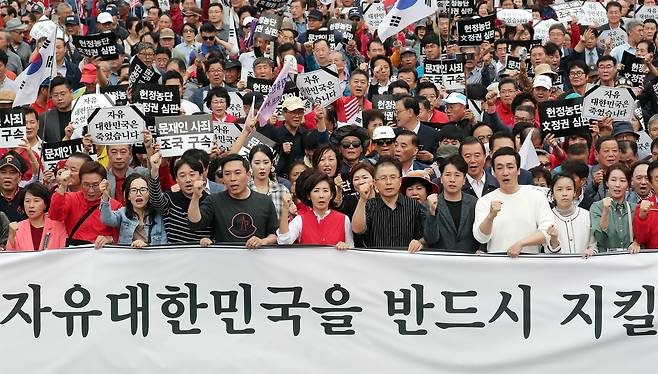 고위공직자범죄수사처(공수처) 신설과 선거제도 개편 관련 법안 등 개혁입법의 패스트랙(신속처리안건제도) 지정에 반발한 자유한국당(이후 미래통합당→국민의힘)의 전국순회 장외투쟁이 한창이던 2019년 5월 25일, 전국을 돌고 광화문광장에 도착한 황교안 대표가 말했다.