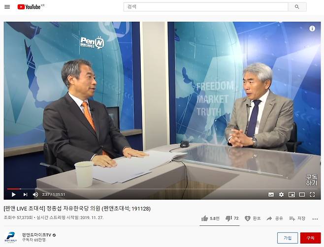 | ▲ 19년 11월 펜앤마이크에 출연한 정종섭 전 의원. <출처 : 펜앤마이크 유튜브 캡쳐> |