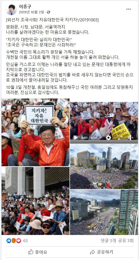 같은 해 10월 3일, 조국 당시 법무부 장관의 사퇴를 외치며 광화문광장 단상에 오른 나경원 원내대표가 말했다.