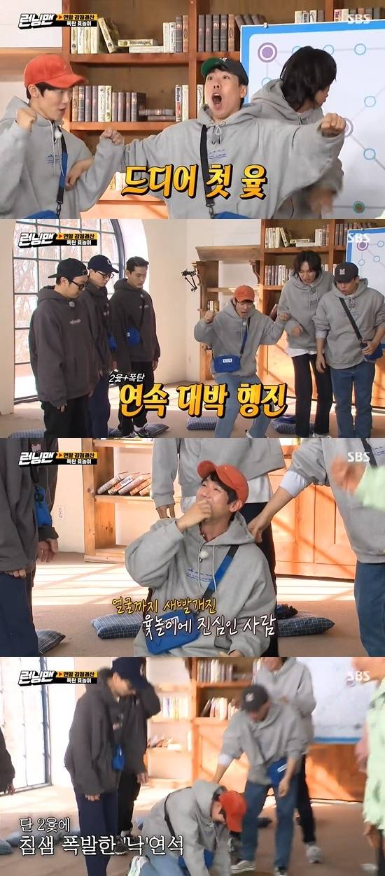 연희 팀(이연희, 송지효, 지석진), 수영 팀(최수영, 전소민, 김종국), 연석 팀(유연석, 이광수, 양세찬), 태오 팀(유태오, 유재석, 하하)은 첫 번째 미션으로 폭탄 윷놀이 게임을 시작했다.