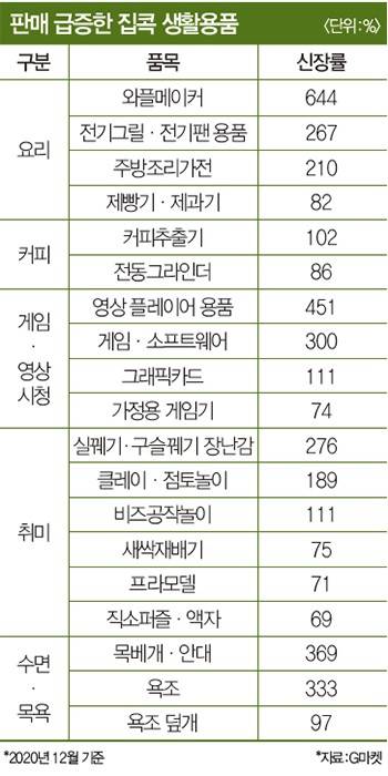G마켓에서는 수면, 목욕 관련 용품 판매가 급증했다. 최근 한 달 목베개·안대 판매 증가율이 지난해 동기 대비 369%에 이른다. 욕조와 욕조 덮개도 각각 333%, 97% 더 잘 팔렸다. 김한수 G마켓 리빙팀장은 “코로나 이후 외출을 자제하는 대신 실내에서 할 수 있는 요리, 커피, 게임 등 각종 손으로 할 수 있는 취미 활동의 판매 수요가 급증했다”며 “관련 시장이 꾸준히 성장세를 기록할 것으로 보인다”고 말했다.