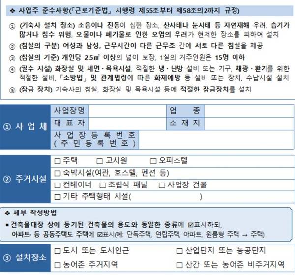 개정된 근로기준법에 의거할 때 산간 또는 농어촌 비거주지역에 설치된 컨테이너, 조립식 패널 등 임시가옥은 기숙사로 적합하지 않기에 금지되어야 했지만, 고용노동부는 이주노동자 기숙사에 대해서는 그대로 허용했다.