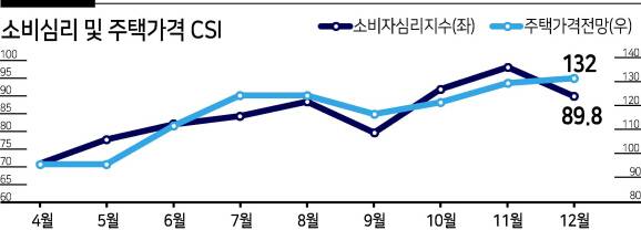 29일 한국은행은 ‘2020년 12월 소비자동향 조사결과’를 발표했다. 주택 가격전망 소비자심리지수(CSI)는 132로, 2013년 1월부터 시작된 관련통계 집계 이래 가장 높았다. 이 지수는 1년 후 집값에 대한 의견 조사다. 숫자가 클수록 상승전망이 강하단 뜻이다. 전달에도 130으로 최고치였다. ▶관련기사 12면