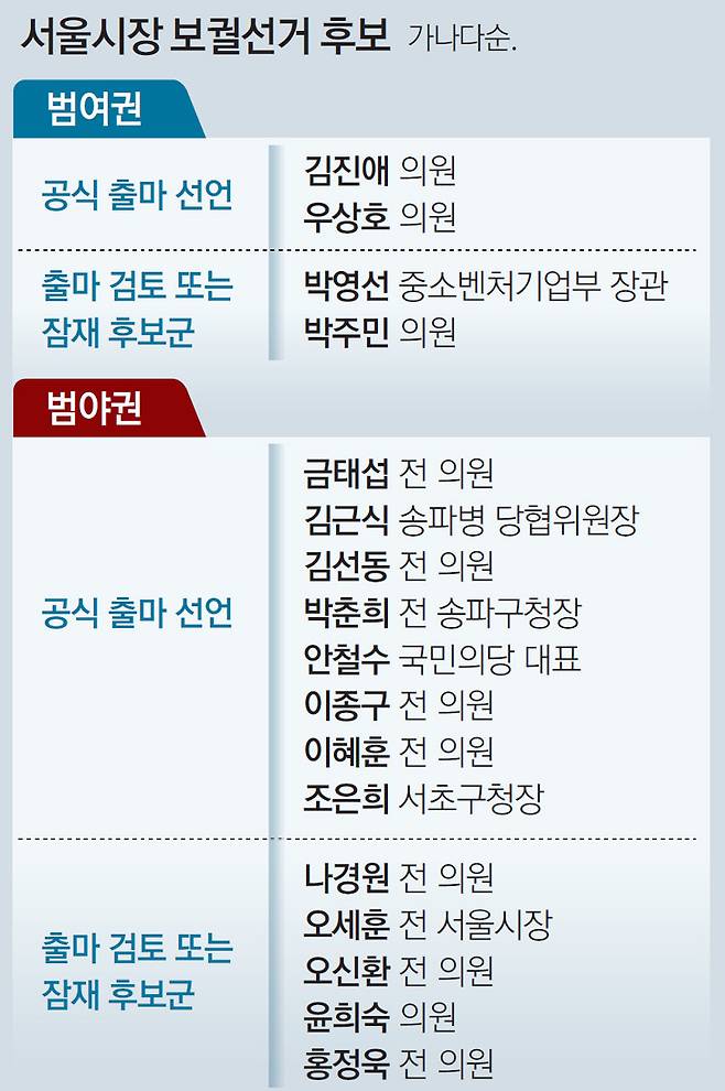 29일 현재 국민의힘에서는 김선동 이종구 이혜훈 전 의원을 비롯해 조은희 서초구청장, 박춘희 전 송파구청장, 김근식 송파병 당협위원장 등 6명이 공식 출마선언을 했다. 범야권으로 폭을 넓히면 국민의당 안철수 대표와 무소속 금태섭 전 의원이 출마를 선언한 상태다.