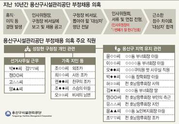 용산구시설관리공단 채용 과정에 참여했던 ㄱ씨와 ㄴ씨는 최근 <한겨레>와 만나, 짬짜미 채용이 이뤄졌다고 말했다. 채용은 성 구청장 비서실의 지시에 따라 이뤄졌다고 한다. 이들은 지난 2010년 이후 공단의 직원 채용은 ‘무늬만 공개채용’이었을 뿐, 실제 뽑힌 사람은 구청 비서실에서 미리 낙점한 사람이었다고 했다. 이들은 “공단에서 구청장 비서실로 공개채용 공고계획을 보고하면, 비서실에서 누구를 뽑을지 통보했다”라며 “공단은 공개채용 공고를 냈지만 실제로는 인사위원회가 비서실에서 내정한 인사를 선발하는 방식으로 부정채용이 이뤄졌다”라고 말했다. ㄴ씨는 “6명을 뽑는다고 하면 실제로는 한명 정도 공채로 뽑을까 말까 하고, 나머지는 성 구청장 지인이나 지인의 가족, 지역유지들이 부탁한 사람들로 구청장 비서실에서 찍어주는 대로 뽑았다”며 “부정채용 의혹이 있는 직원이 100명이 넘는다”고 설명했다.