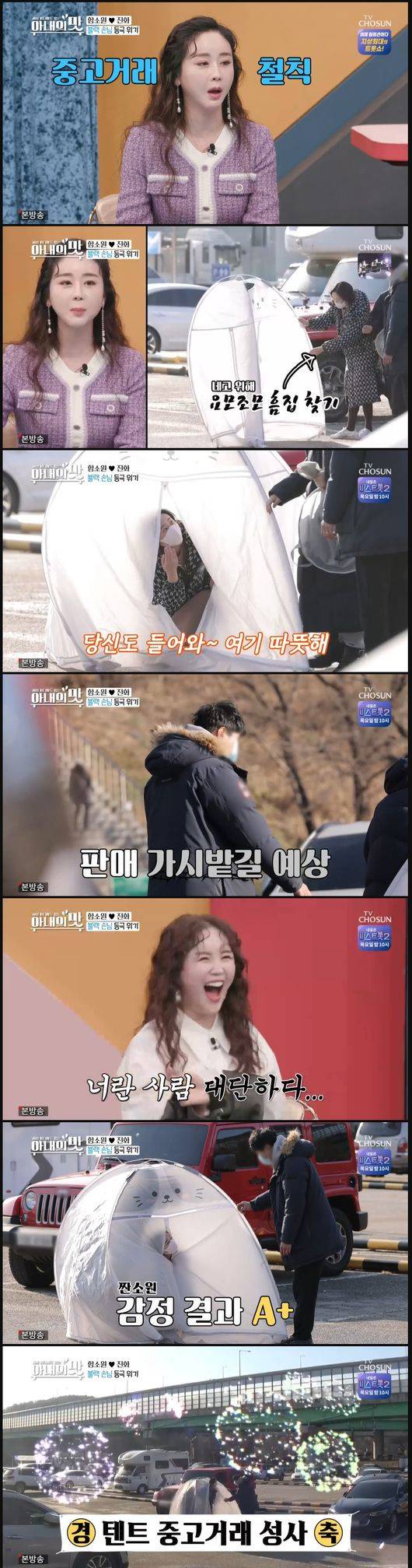 하지만 모니터 속에서 함소원은 급기야, 판매자와 돈 거래전, "그래도 확인해봐야한다"며 판매자 앞에서 텐트를 펼쳤다. 길바닥 한 가운데서 텐트를 치는 모습이 모두의 눈을 의심하게 했다.