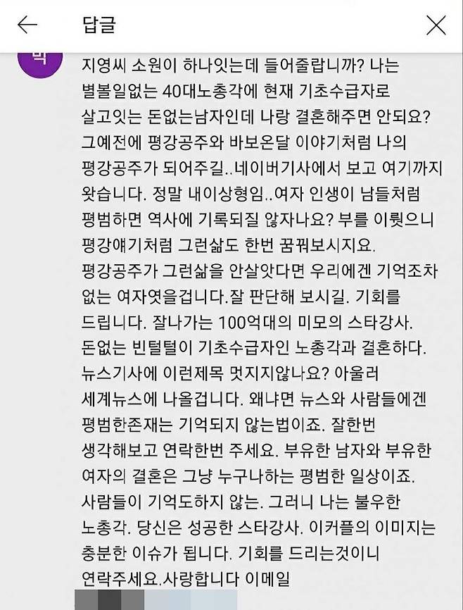 자신을 40대 노총각에 현재 기초수급자로 살고 있는 돈 없는 남자라고 소개한 한 남성은 장문의 댓글을 남기며, 이지영에게 "결혼해달라"고 조르고 있다.