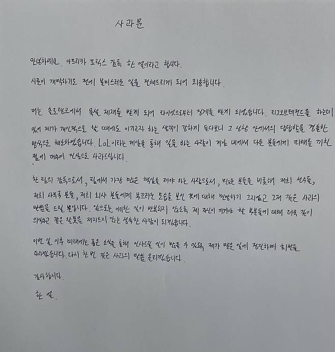 30일 오후 아프리카 프릭스는 공식 SNS를 통해 '릭시' 한얼 감독의 부적절한 인게임 언행으로 인한 라이엇 게임즈의 출장 정리 처분에 대한 자필 사과문을 게시했다.