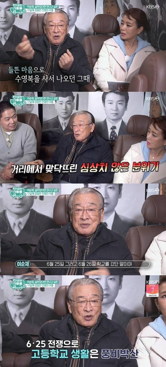 이후 고등학교 시절을 묻는 김원희의 질문에 이순재는 "그때 6.25 전쟁이 터졌다. 재밌는 일화가 있다. 그때 동생이랑 수영복을 사러 나갔다"라며 "갑자기 군용차가 돌아다니면서 휴가 나온 장병들 빨리 복귀하라고 하더라"라며 당시 상황을 전했다.