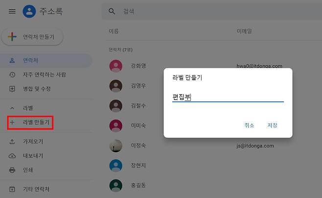 연락처가 많으면 집단으로 구분해서 저장하는 편이 좋다. 특정 집단의 연락처만 저장하거나, 그 집단에게 한꺼번에 메일을 따로 보낼 수 있기 때문이다. 구글 연락처에서는 라벨 기능을 이용해 집단을 구분한다. 주소록 페이지 왼쪽 목록에서 '라벨 만들기'를 선택한다. 라벨 만들기 대화상자가 나타나면 그룹명을 입력한 다음 '저장' 버튼을 누른다. 예시로 '편집부'를 입력했다.