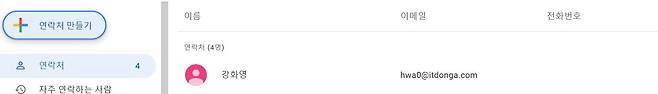 구글 주소록에 연락처를 입력하자. 먼저 구글 홈페이지 첫 화면에서 프로필 이미지 바로 왼쪽 '구글 앱' 버튼을 누른 뒤 '주소록'을 선택한다. 주소록 화면이 나타나면 왼쪽 메뉴에서 '연락처 만들기' 버튼을 선택한다.