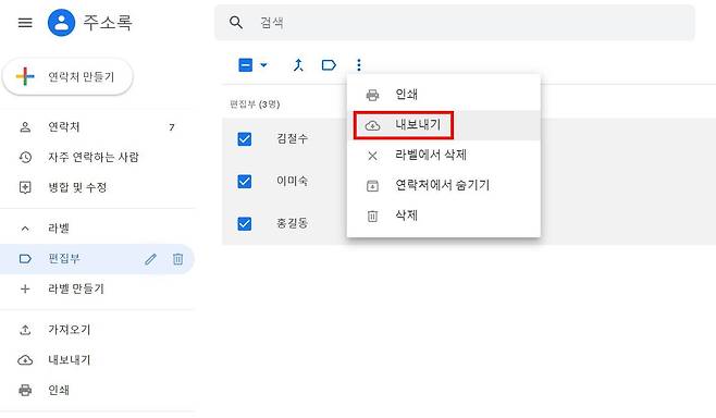 특정 집단에 속한 사용자 연락처만 따로 저장해서 다른 사용자에게 공유하자. 연락처를 파일로 저장한 다음 해당 파일을 구글 드라이브에 저장한다. '내보내기' 기능을 이용해서 특정 집단 연락처를 공유해보자. 왼쪽 메뉴에서 '내보내기'를 선택한다.