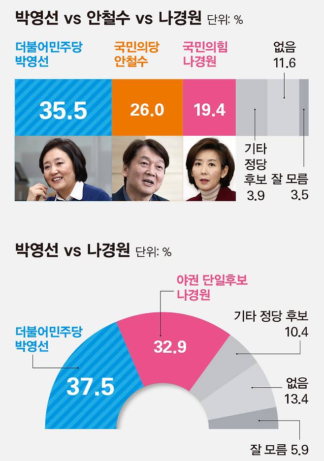 현 상황에서 야권 분열은 곧 여권 승리로 이어질 가능성이 크다. 이러한 분위기는 이번 여론조사 결과에도 그대로 반영됐다. 민주당이 서울시장 후보로 박영선 장관을 내세우고, 야권에서는 국민의힘 나경원 전 의원과 국민의당 안철수 대표가 각자 출마하는 '3자 구도'가 된다면 여권 후보가 승리할 가능성이 높은 것으로 나타났다. 3자 구도 가상대결 조사에서 박 장관이 35.5%로 오차범위를 벗어난 1위로 나왔고, 안 대표는 26.0%, 나 전 의원은 19.4%를 각각 기록했다.