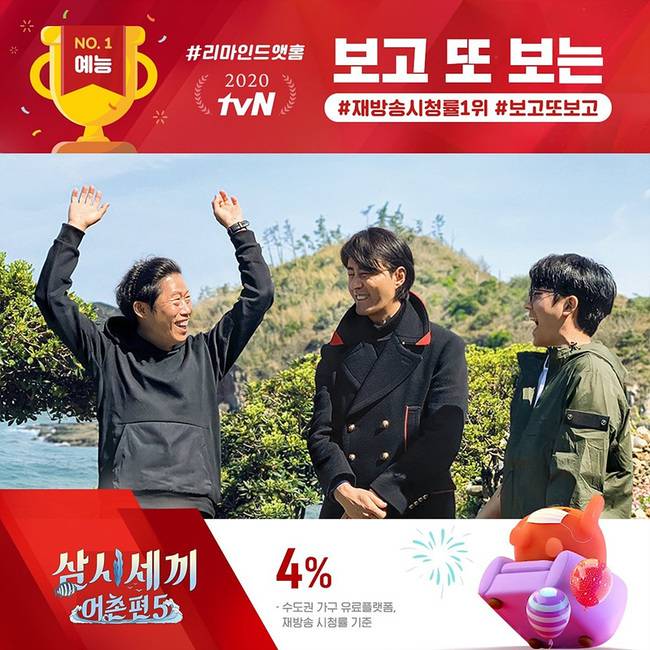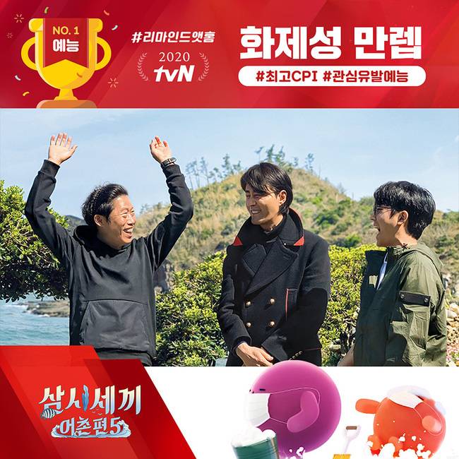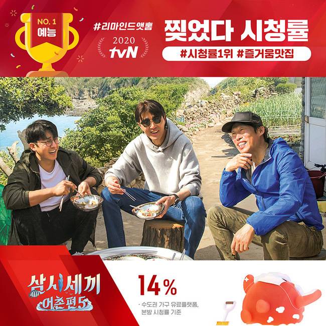 시청률에서 대기록을 세운 예능은 '삼시세끼 어촌편5'이었다. 5년 만에 다시 뭉친 유해진, 차승원, 손호준의 '삼시세끼 어촌편5'는 오랜 기다림에 부응하며 방영 내내 편안한 웃음을 선사했다. 그 가운데서도 시리즈의 원조 이서진이 세 사람을 찾아온 9회는 평균 시청률 14%를 기록, 올해 예능 가운데 가장 높은 시청률을 달성했다. '최고의 1분' 시청률 역시 9회에서 탄생했다. 네 사람이 정성이 가득 담긴 아침 식사를 마치고 마지막 낚시를 떠나는 유해진을 배웅하는 장면에서 순간 시청률이 무려 18%까지 치솟으며 출연진의 케미를 향한 시청자들의 애정을 드러냈다. '삼시세끼 어촌편5'을 향한 관심은 재방송까지 이어져 재방송 가구 기준에서도 예능 1위에 올랐다. (수도권 가구 / 케이블, IPTV, 위성 통합한 유료플랫폼 기준 / 닐슨코리아 제공)