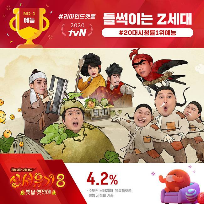 20대에게 가장 큰 사랑을 받은 예능은 '신서유기8'이었다. '신서유기8-옛날옛적에'는 매회 상상을 뛰어넘는 분장과 '훈민정음 윷놀이', '좀비게임'을 비롯한 신상 게임으로 매주 금요일 밤 시름을 날리며 20대 최고 시청률 4.2%를 기록했다. (수도권 남녀20대 / 케이블, IPTV, 위성 통합한 유료플랫폼 기준 / 닐슨코리아 제공)