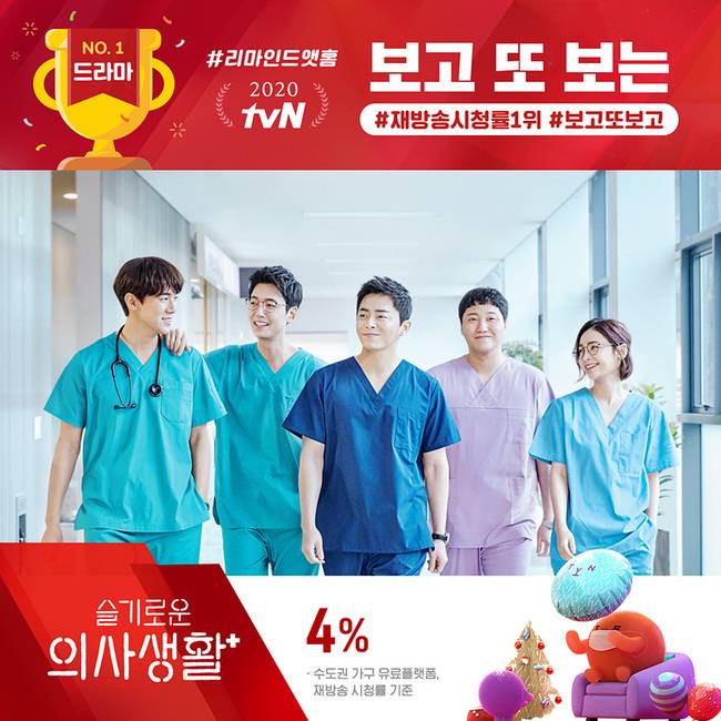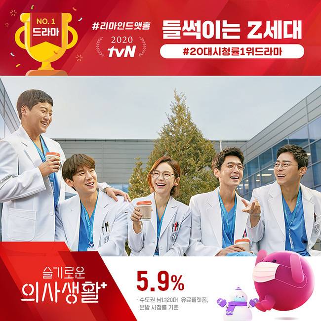 20대 시청자, 일명 Z세대의 마음을 사로잡은 드라마는 '슬기로운 의사생활'이었다. '슬기로운 의사생활'은 익준(조정석 분), 정원(유연석 분), 준완(정경호 분), 석형(김대명 분), 송화(전미도 분) 5인방의 우정과 현실적인 에피소드로 남녀노소 큰 사랑을 받았던 레전드 드라마. '슬기로운 의사생활'은 20대 최고 시청률 5.9%를 기록했으며, 동시에 올해 온라인 동영상 서비스(OTT) 티빙(TVING)에서 가장 많은 사랑을 받은 드라마 1위로도 선정되며 스마트폰 등 기기를 통한 콘텐츠 시청에 익숙한 Z세대의 사랑을 입증했다. 뿐만 아니라 '슬기로운 의사생활'은 재방송 가구 시청률에서도 드라마 1위에 올랐다.