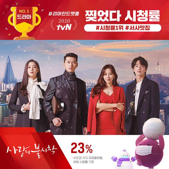 먼저 국내뿐 아니라 해외에서도 큰 인기를 얻으며 K-드라마 열풍을 일으킨 '사랑의 불시착'이 드라마 중 가장 높은 시청률을 기록했다. 돌풍과 함께 패러글라이딩 사고로 북한에 불시착한 재벌 상속녀 윤세리(손예진 분)와 그녀를 숨기고 지키다 사랑하게 되는 북한 장교 리정혁(현빈 분)의 절대 극비 로맨스가 매회 시청자들을 웃고 울린 것. 그 가운데서도 가슴 따뜻해지는 엔딩으로 막을 내린 최종화는 평균 시청률 23%를 기록하며 큰 호응을 얻었다. '최고의 1분' 순간 시청률 또한 최종화에서 나왔다. 전초선에서 돌아온 리정혁과 중대원들을 맞이하는 식사 자리에서 표치수(양경원 분)가 새로운 중대장으로 소개되는 장면에서 시청률이 최고 26%까지 오르며 명품 조연 배우들의 활약이 빛났던 드라마였음을 알렸다.